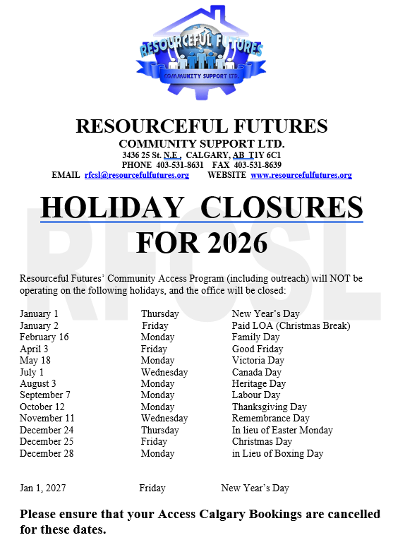 Resourceful Futures Community Access Program (including outreach) will NOT be operating on the following days: